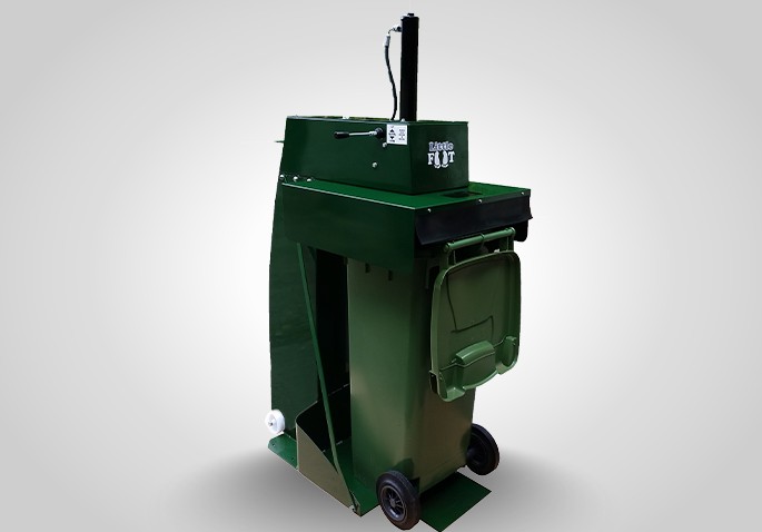 De grotere versie van de afvalpers kan gebruikt worden op rolcontainers van 1100 liter.