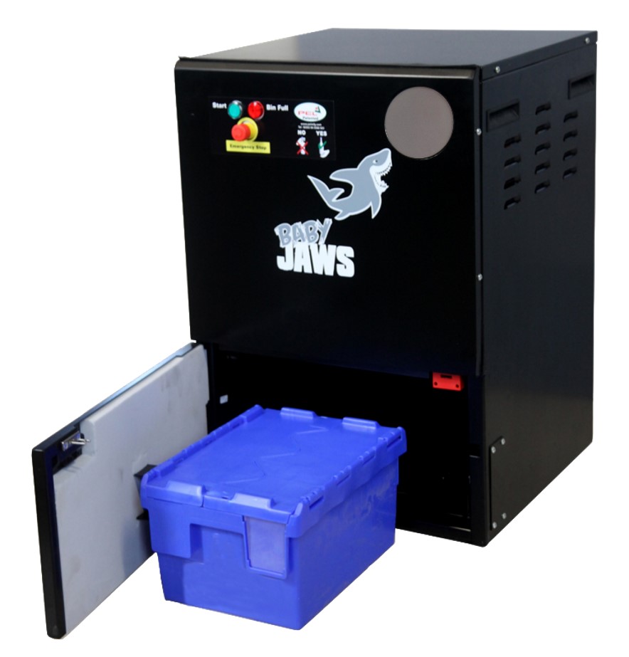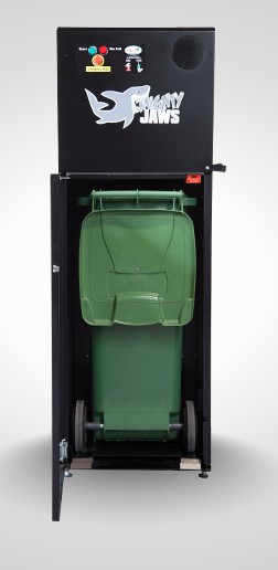 Deze professionele glascrusher kan onder een toonbank geplaatst worden en verkleint op een geluidsarme manier flessen tot een kleine fractie.